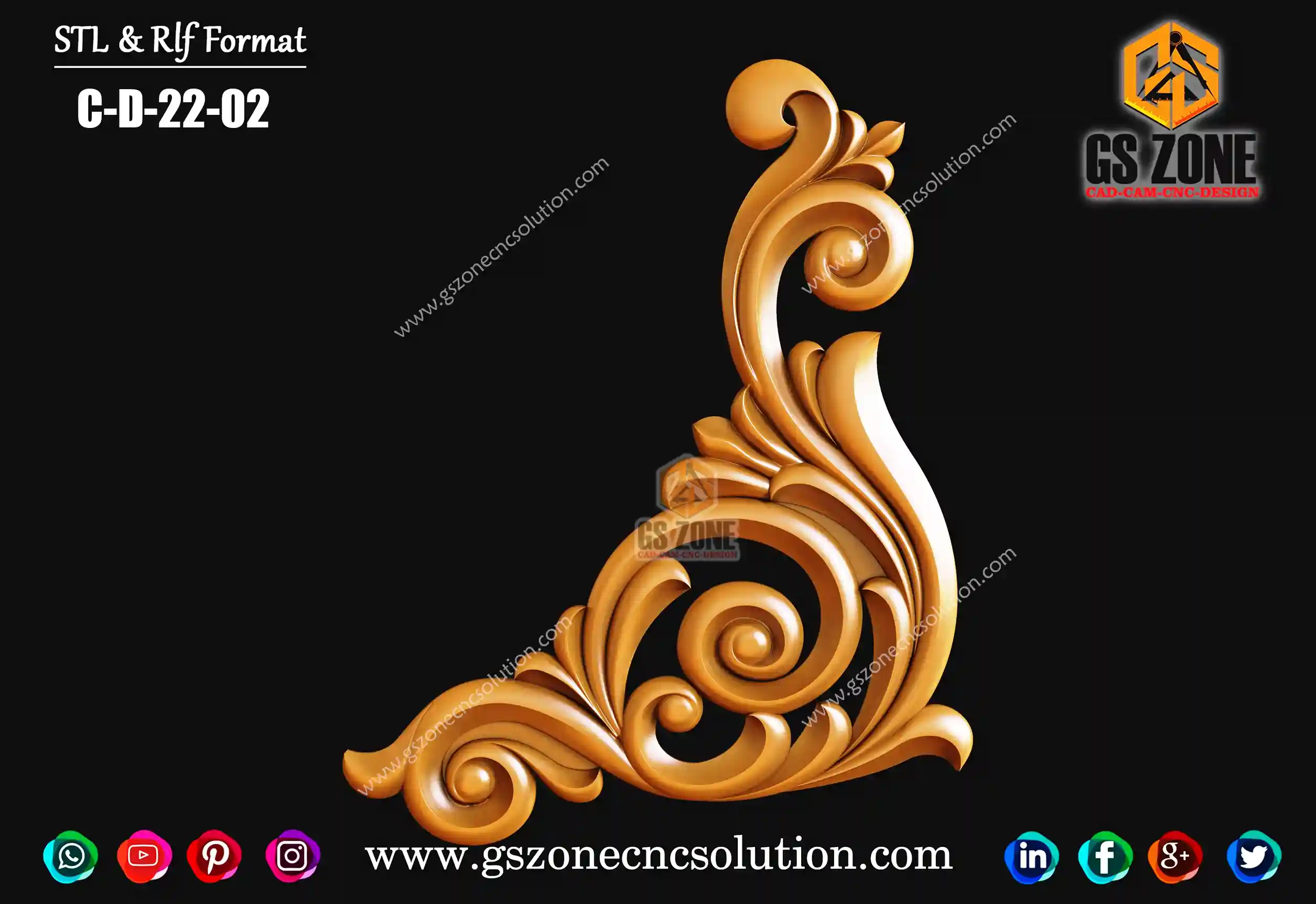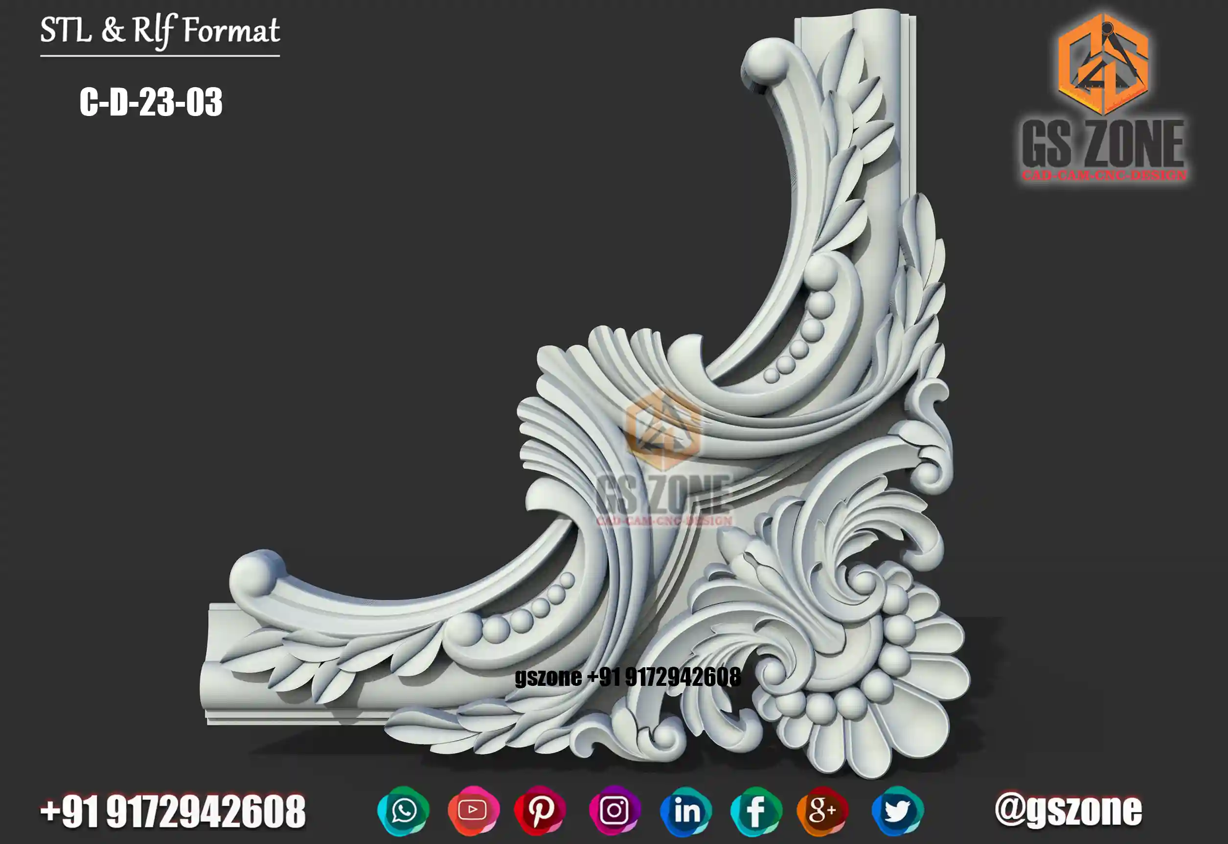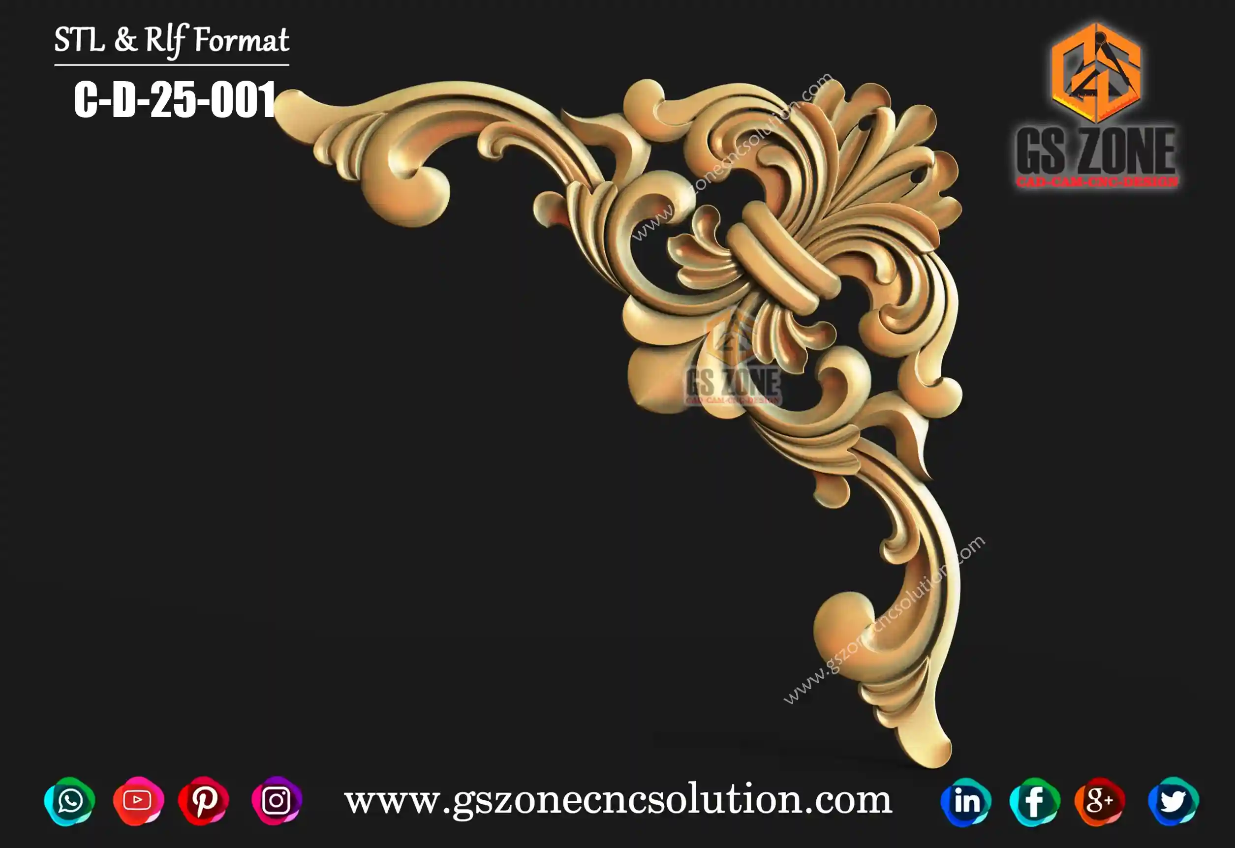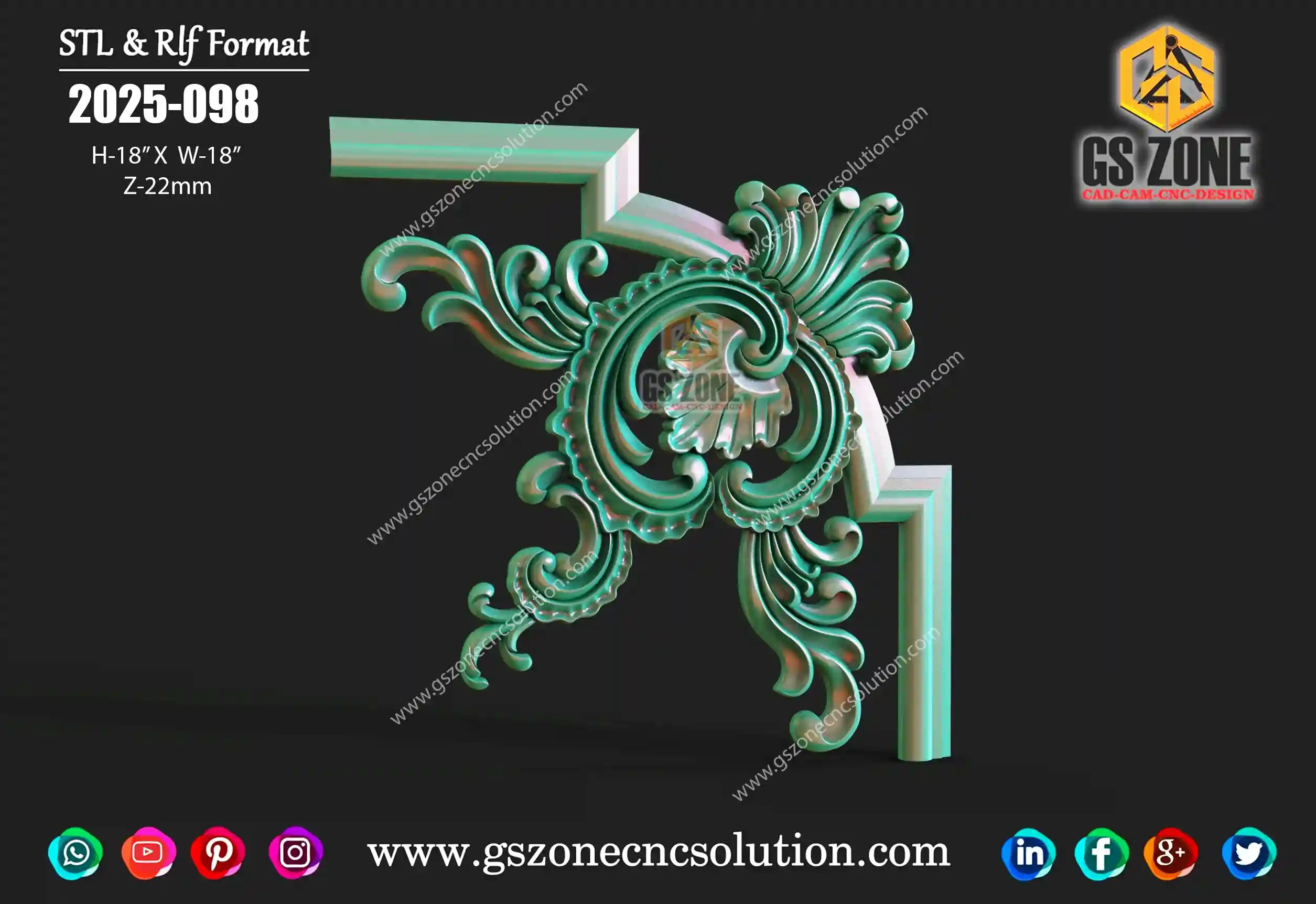 🔶 C-D-25-06 | 3D Floral Corner Design – GSZone Exclusive 📏 Design Size: • Height: 17" • Width: 17" 🔍 Z-Depth: 5 mm 📁 File Formats: .RLF & .STL (ArtCAM / CNC Ready)
