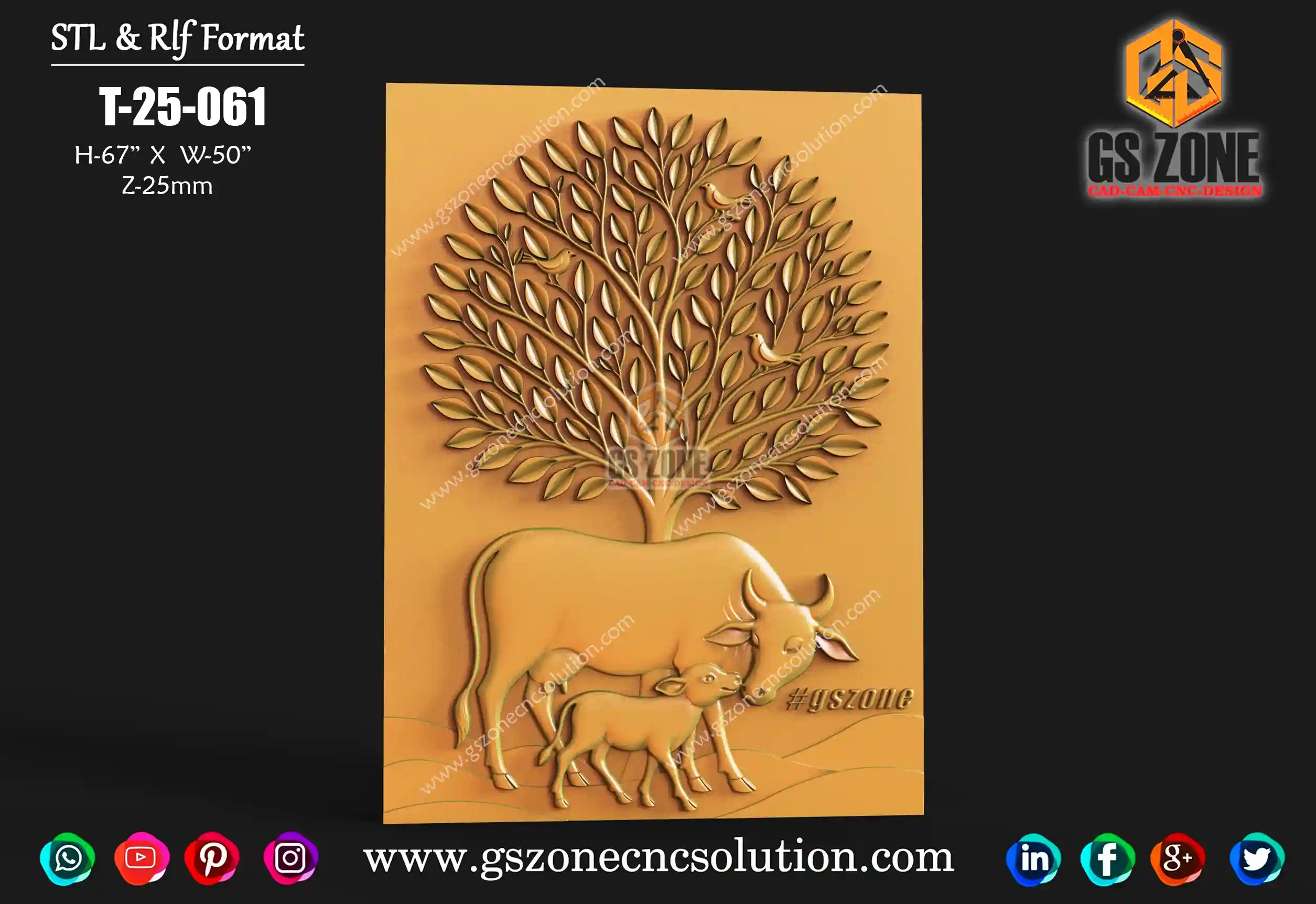 🪵 GSZone 3D Tree Panel Design | T-25-061 📏 Size & Dimensions: Height – 67 inch | Width – 50 inch ⚙️ Z-Depth: 25 mm 💾 File Formats: 🗂️ STL & RLF 🌿 Design Highlights: Beautiful 3D carving of a cow and calf under a tree, symbolizing peace, nature, and devotion. Perfect detailing with elegant leaf patterns and natural curves for high-end CNC finishing.