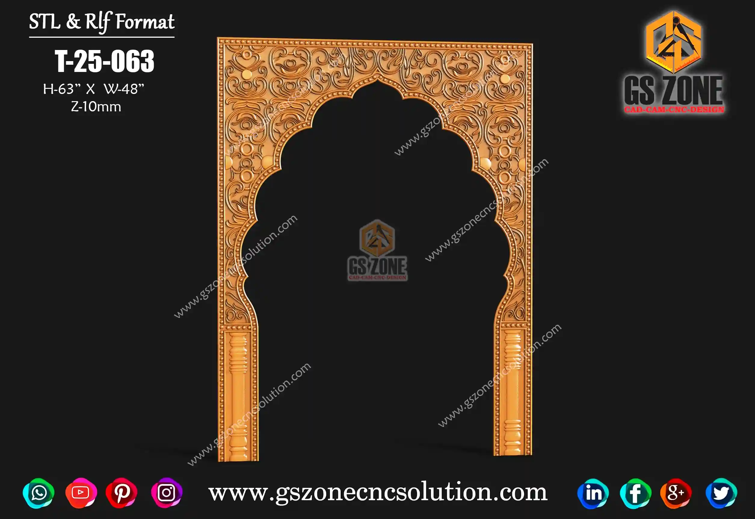🪵 GSZONE CNC ARCH FRAME DESIGN – T-25-063 📏 Size & Dimensions Height: 63” Width: 48” Z-Depth: 10mm 🧩 File Formats Available in .STL & .RLF formats