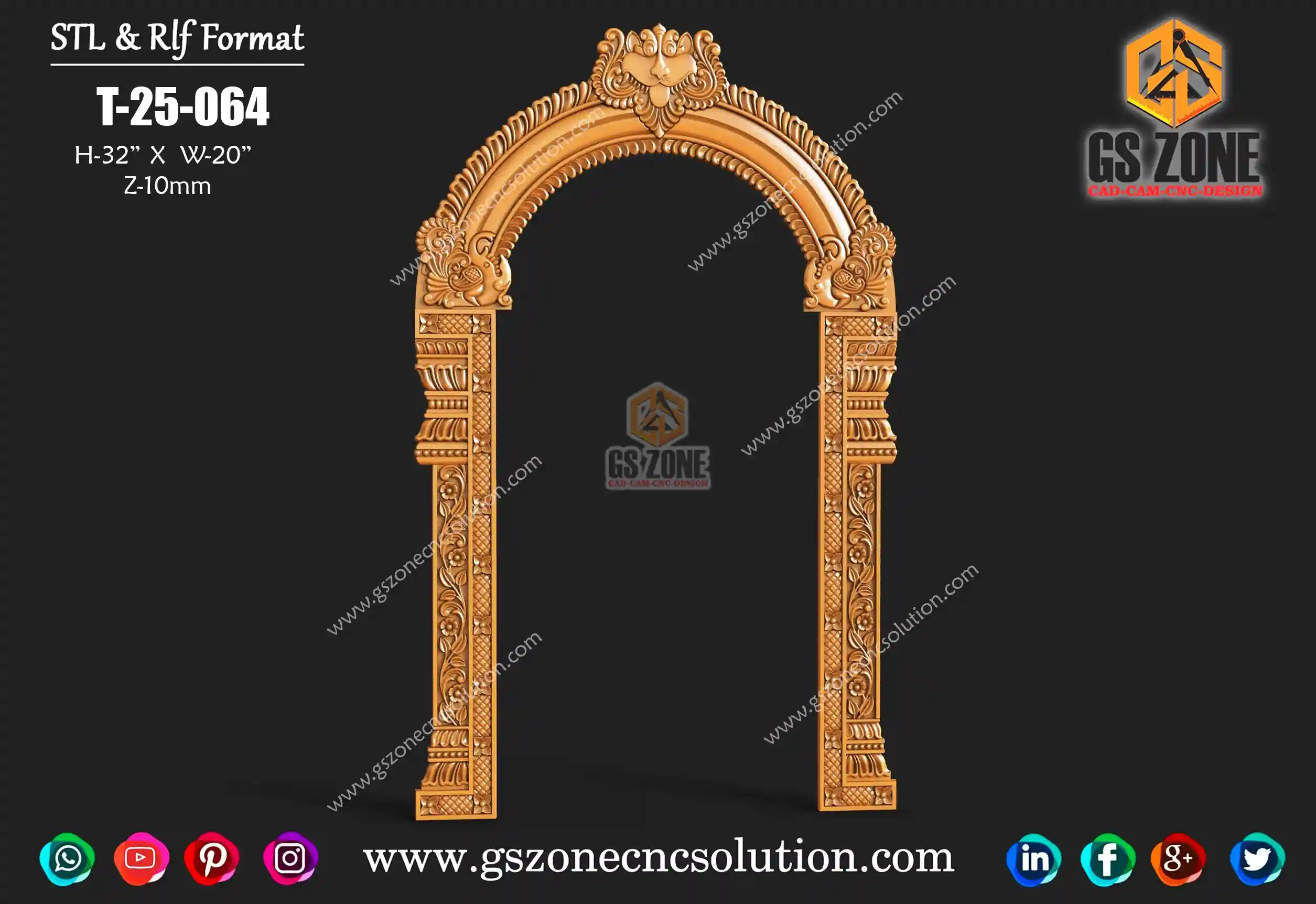 🪵 GSZONE CNC ARCH FRAME DESIGN – T-25-064 📏 Size & Dimensions Height: 32” Width: 20” Z-Depth: 10mm 🧩 File Formats Available in .STL & .RLF formats