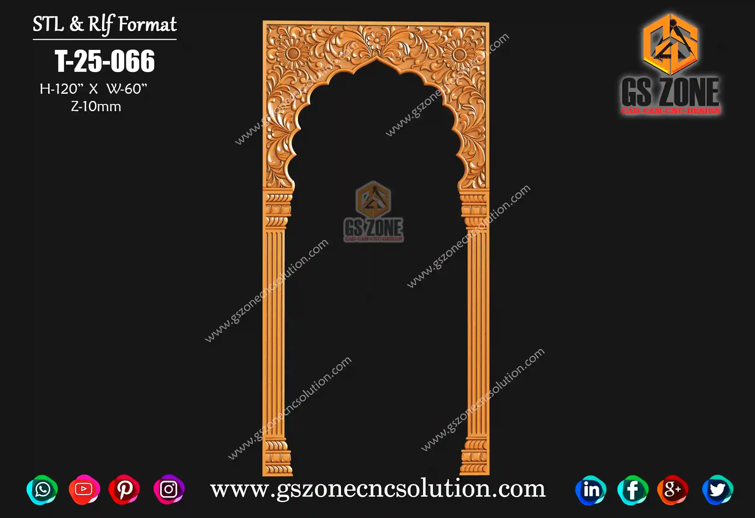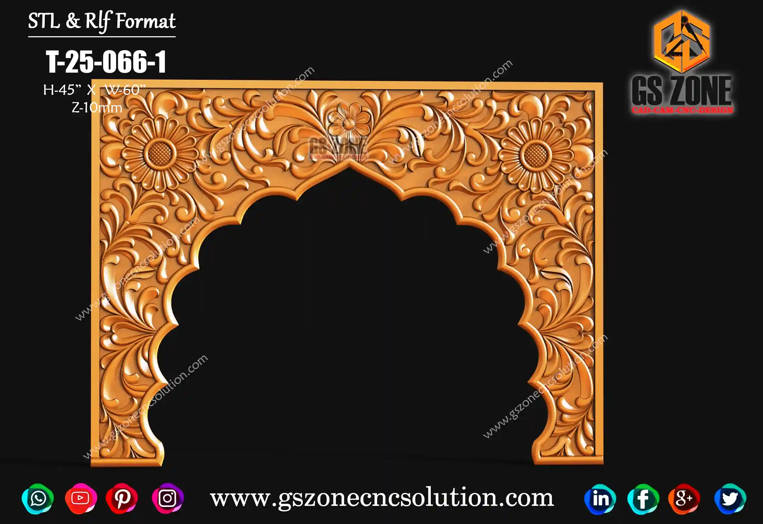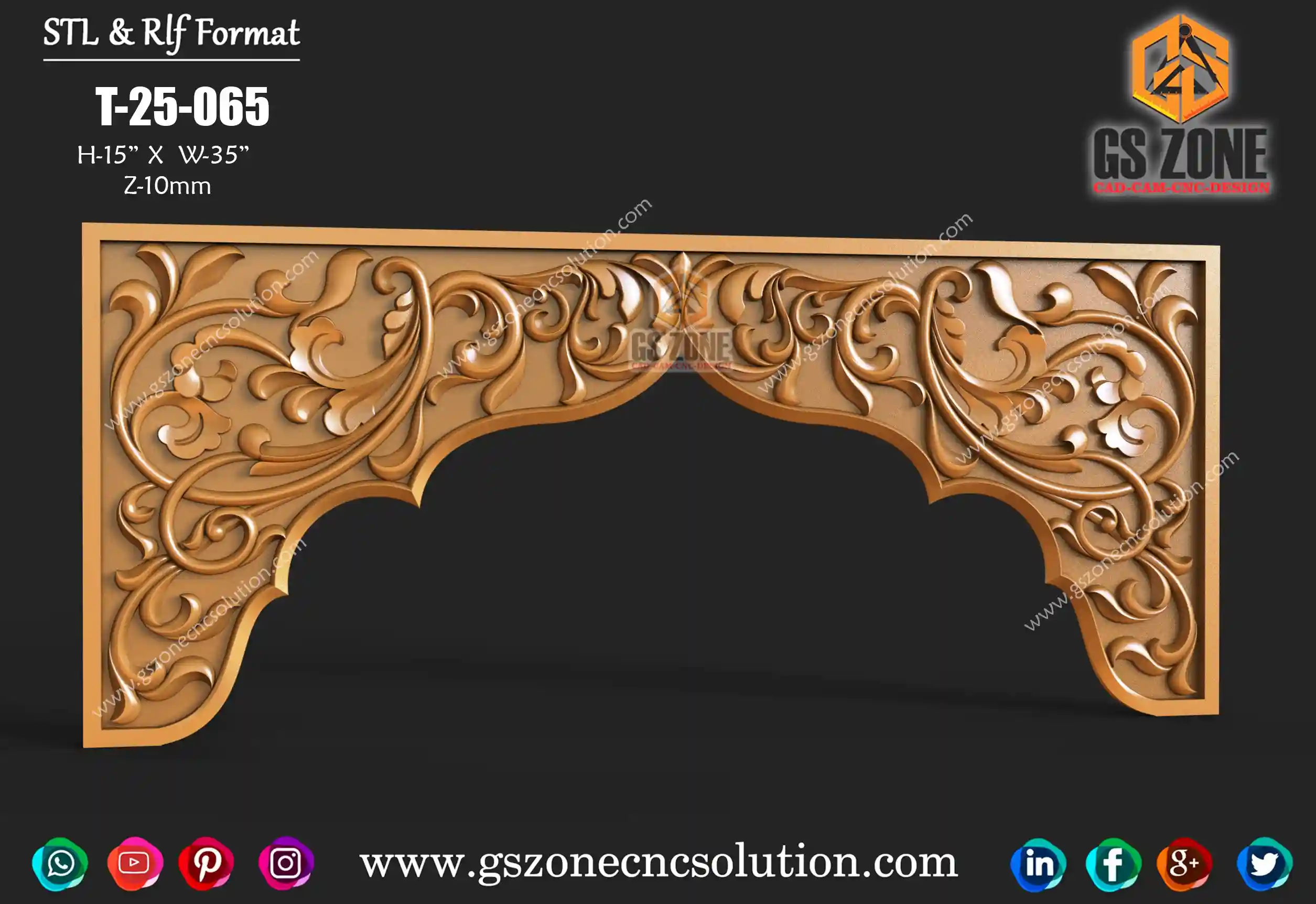 🪵 GSZONE CNC ARCH PANEL DESIGN – T-25-065 📏 Size & Dimensions Height: 35” Width: 15” Z-Depth: 10mm 🧩 File Formats Available in .STL & .RLF formats