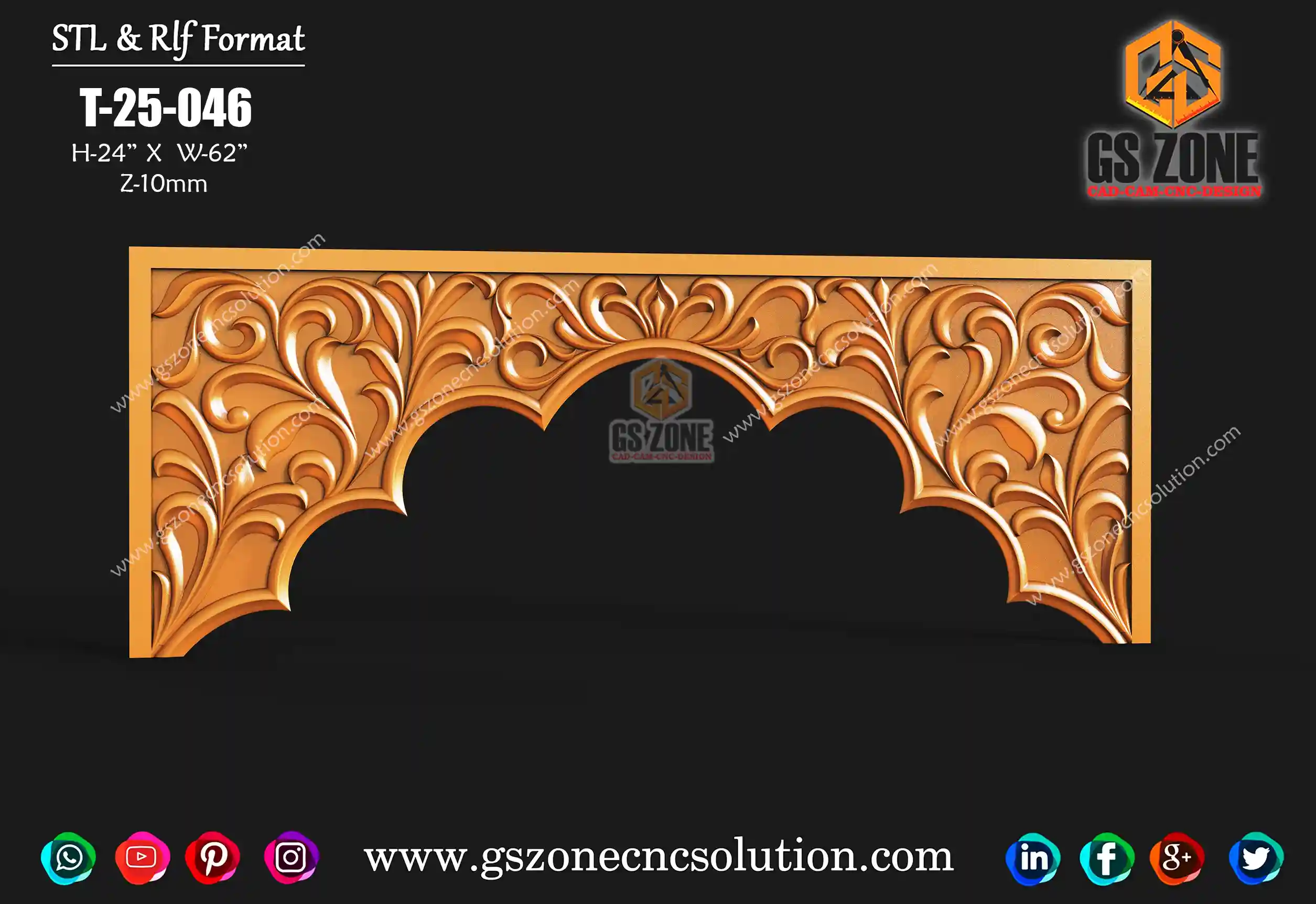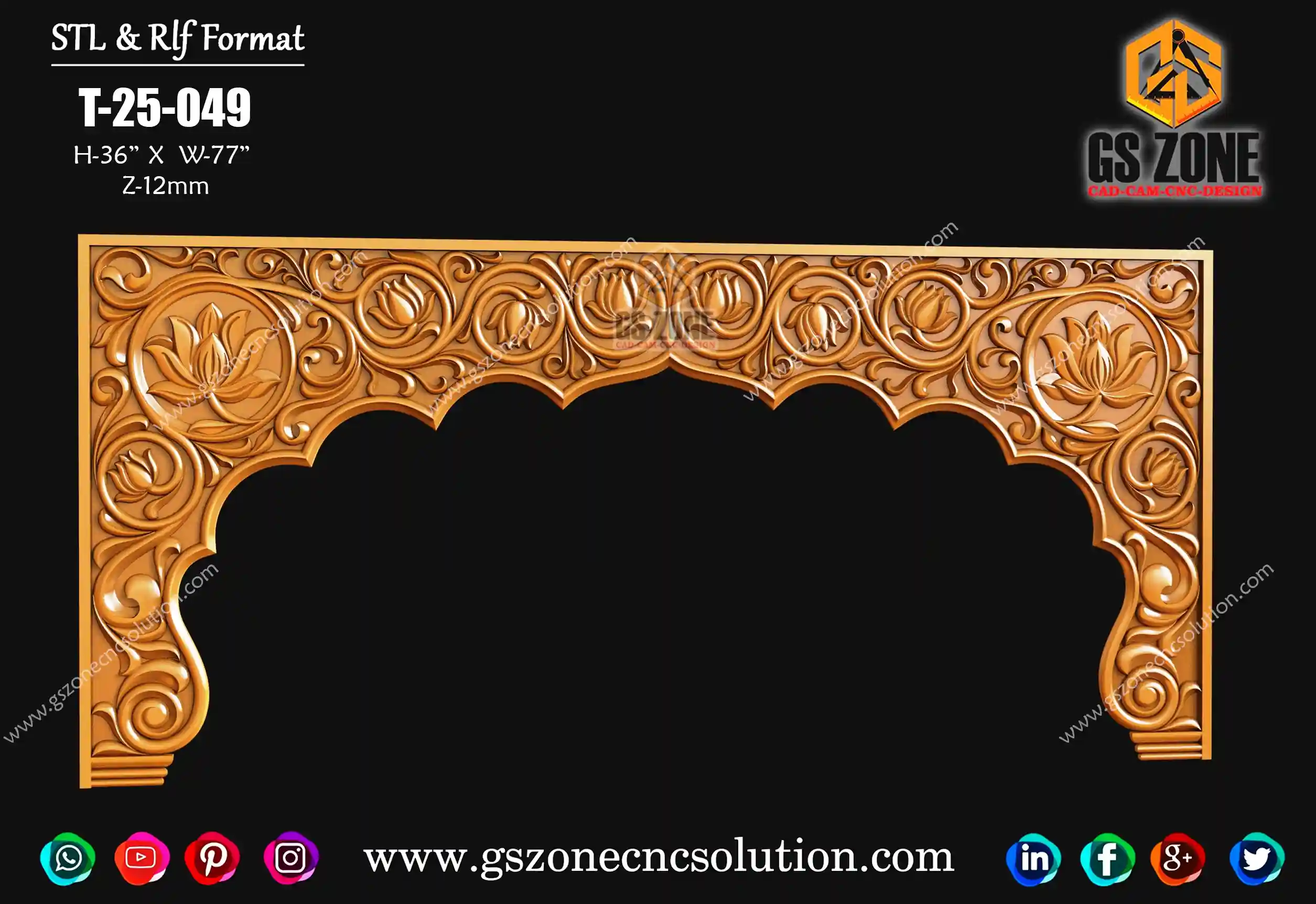 🛕 GSZONE 3D Temple Arch Design – Royal Floral Elegance Panel 🔖 Product Code: T-25-046 📐 Size: Height – 24" | Width – 62" | Z-Depth – 10mm 📁 File Formats: STL & RLF (CNC Ready)