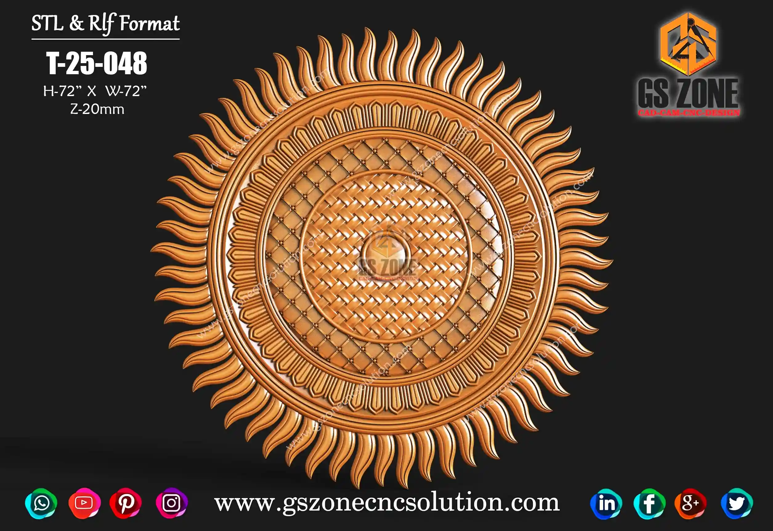 🌞 T-25-048 | 3D Sun Mandala Panel 📐 Specifications Design Size: Height – 72" | Width – 72" Z-Depth: 20 mm File Formats: STL & RLF (CNC / ArtCAM Ready)