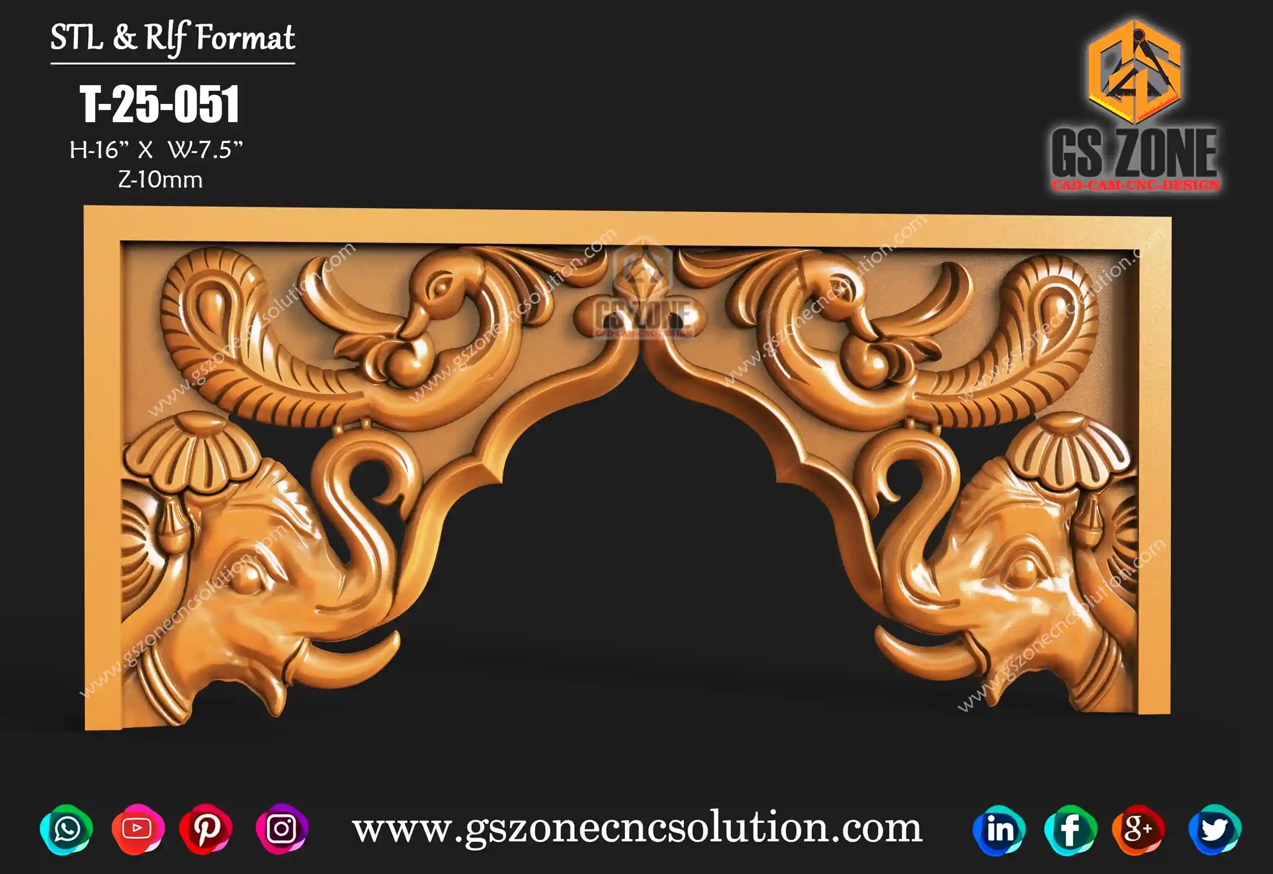 T-25-051 | 3D Temple Arch Panel – Elephant & Peacock Motif 📐 Specifications Design Size: Height – 16" | Width – 7.5" Z-Depth: 10 mm File Formats: STL & RLF (CNC / ArtCAM Ready)