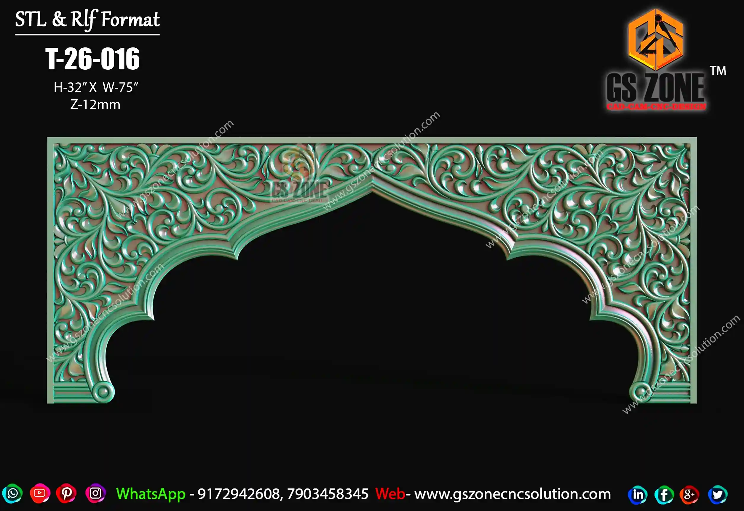 🔷 GS Zone CNC Solution™ 🔷 🛕 CNC Temple Arch Panel Design 🛕 🆔 Design Code: T-26-016 📐 Size & Dimensions: Height (H): 32 Inches Width (W): 75 Inches Depth (Z): 12 mm 💾 File Formats: ✔ STL (CNC Machine Ready) ✔ RLF (ArtCAM Editable File) ✨ Design Description: This premium Temple Arch Panel is specially designed for mandir and spiritual interior applications. The design features elegant floral carvings with a traditional arch structure, giving a divine and luxurious appearance after CNC machining.