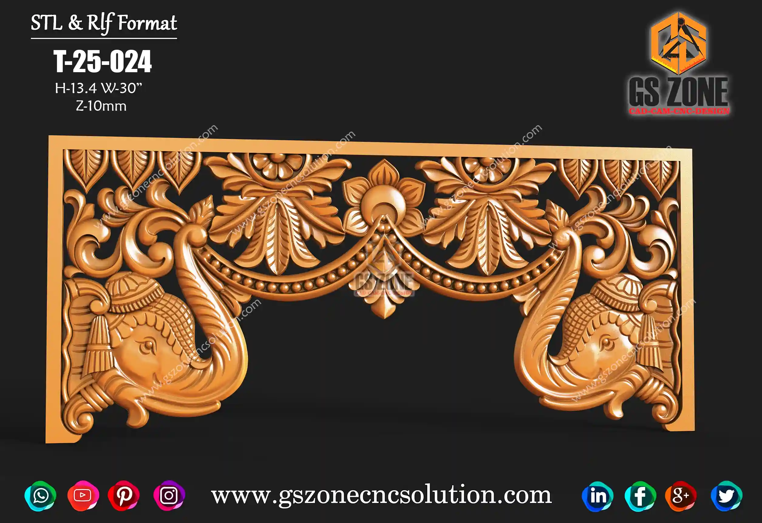 🌟 GSZONE 3D CNC Mandir Toran – Elegant Floral Arch 🔖 Product Code: T-25-026 📐 Size: Height – 10" | Width – 26" | Depth – 8mm 📁 File Formats: STL & RLF (Fully CNC Compatible)