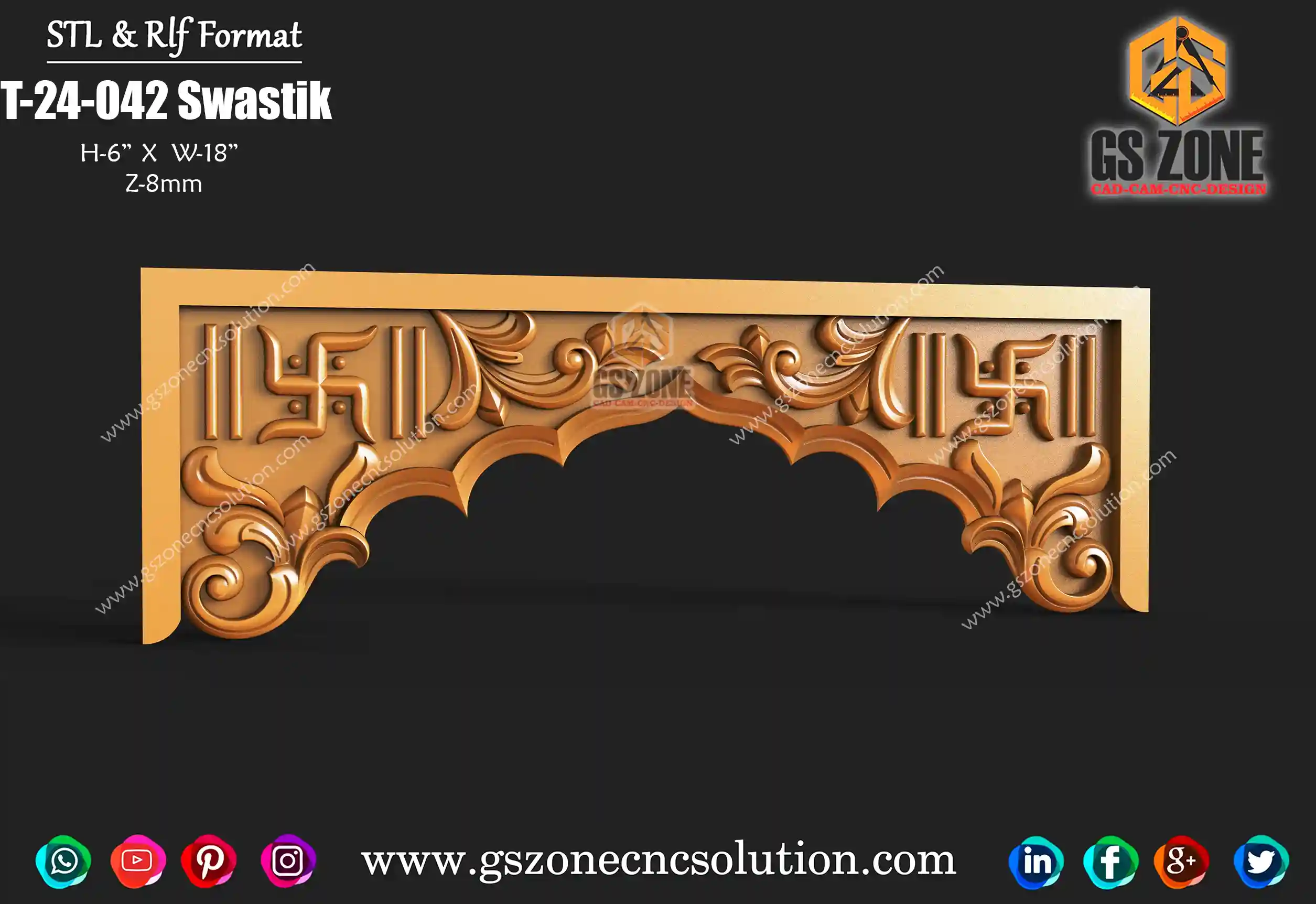 🌟 GSZONE 3D CNC Temple Toran – Swastik Edition 🔖 Product Code: T-24-042 Swastik 📐 Size: Height – 6" | Width – 18" | Depth – 8mm 📁 File Formats: STL & RLF (Fully CNC Ready)