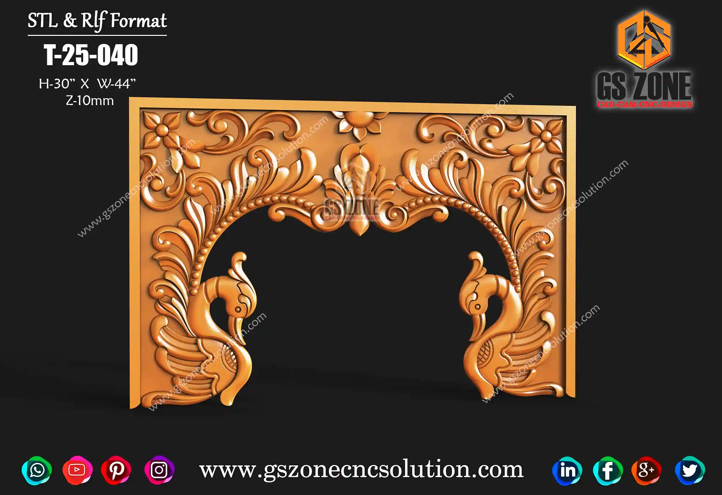 🛕 GSZONE 3D CNC Peacock Mandir Arch Design 🔖 Product Code: T-25-040 📐 Size: Height – 30" × Width – 44" 🌀 Z-Depth: 10mm 📁 File Formats: STL & RLF (Ready for CNC Router)