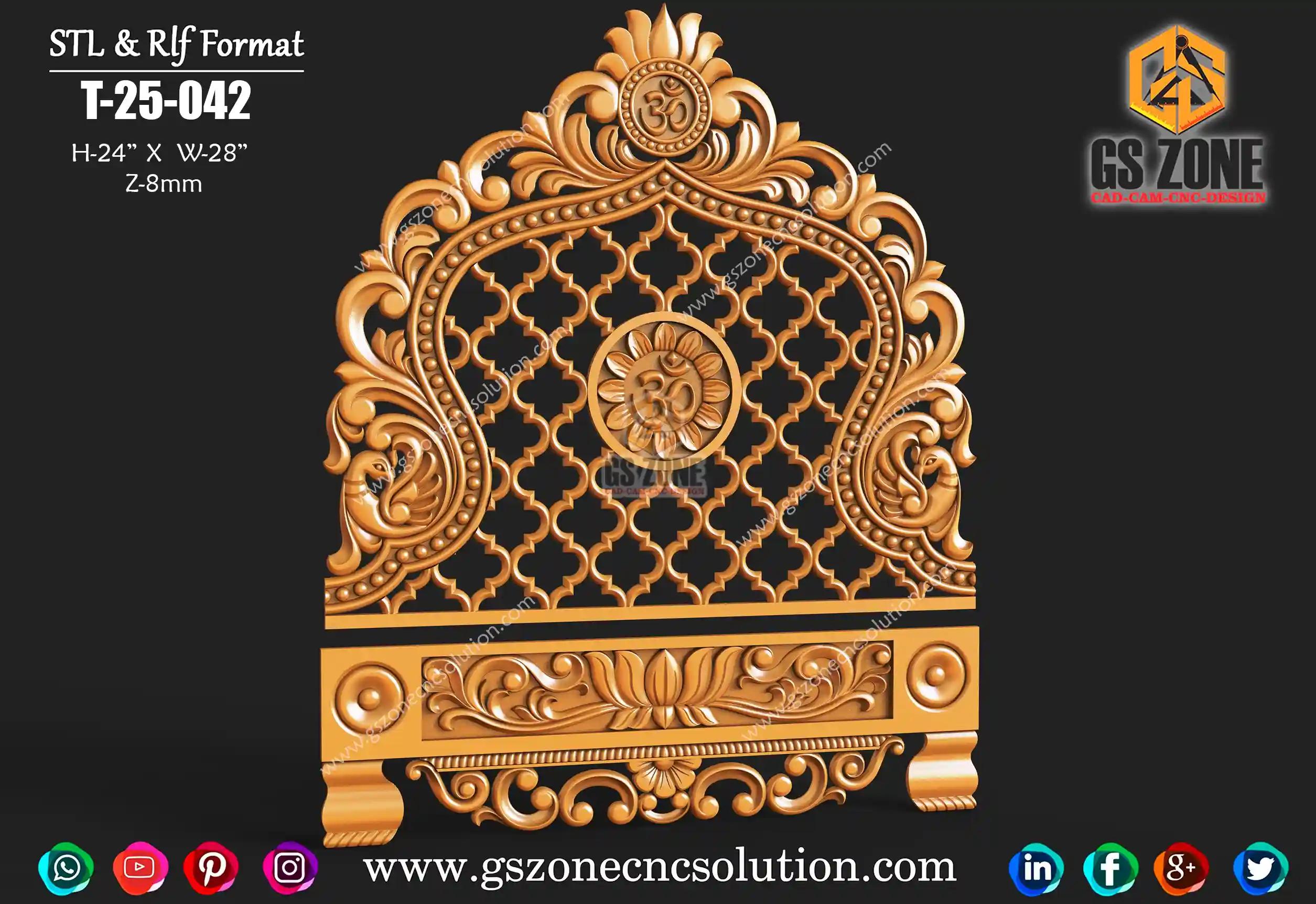 ✅ GSZONE 3D Temple Jali Panel Design 🔖 Product Code: T-25-042 📏 Size: H – 24 inches | W – 28 inches 📐 Z-Depth: 8 mm 📁 File Formats: .RLF & .STL (Fully compatible with ArtCAM & CNC Router machines) 🛠️ Application: Ideal for mandir back panels, wooden temple jali work, wall décor, pooja units, and spiritual CNC artworks.