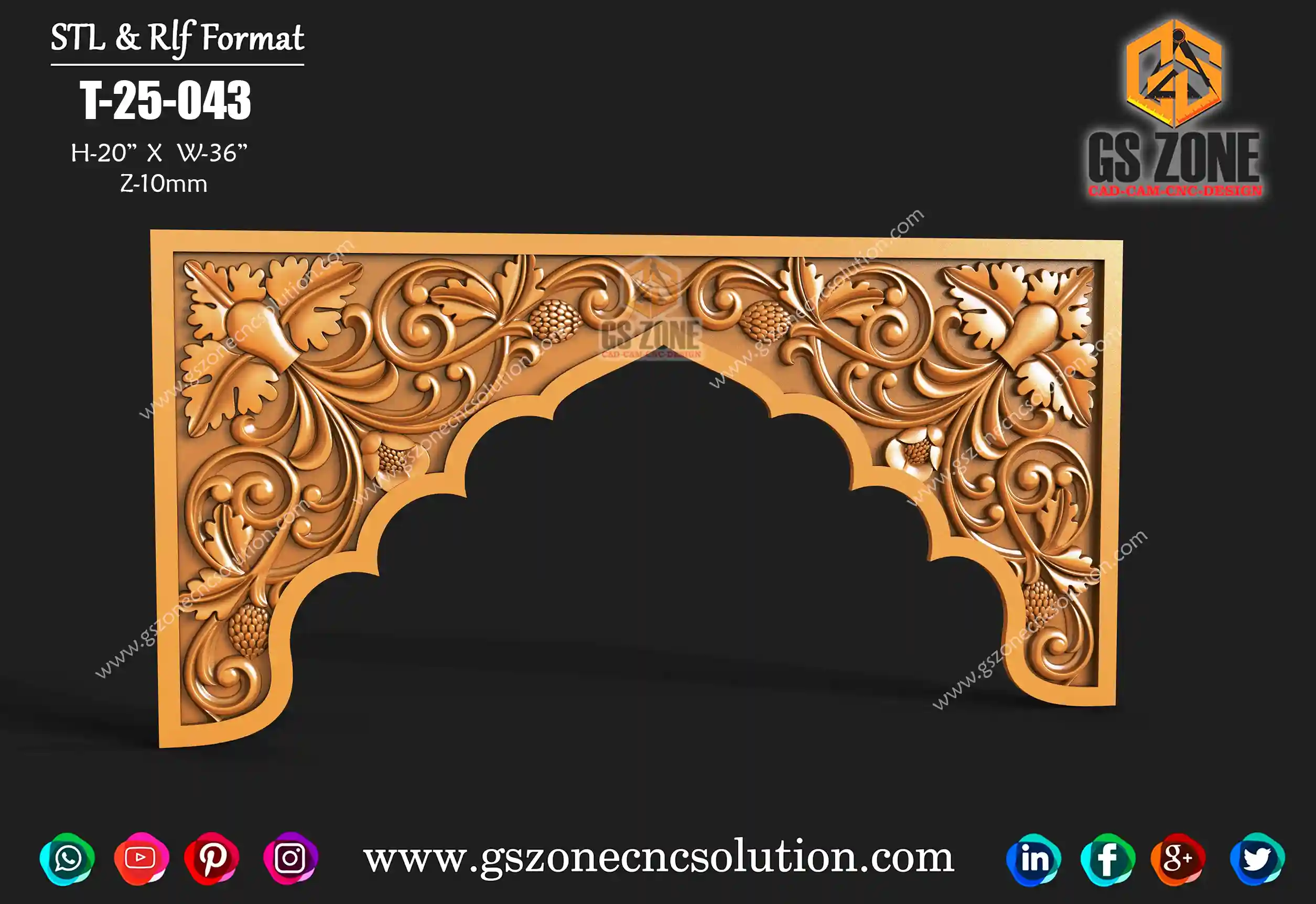 ✅ GSZONE 3D Temple Arch Design 🔖 Product Code: T-25-043 📏 Size: H – 20 inches | W – 36 inches 📐 Z-Depth: 10 mm 📁 File Formats: .RLF & .STL (Fully compatible with ArtCAM & CNC Router machines) 🛠️ Application: Suitable for CNC mandir arch work, pooja unit tops, wooden frame arches, and temple entrances.