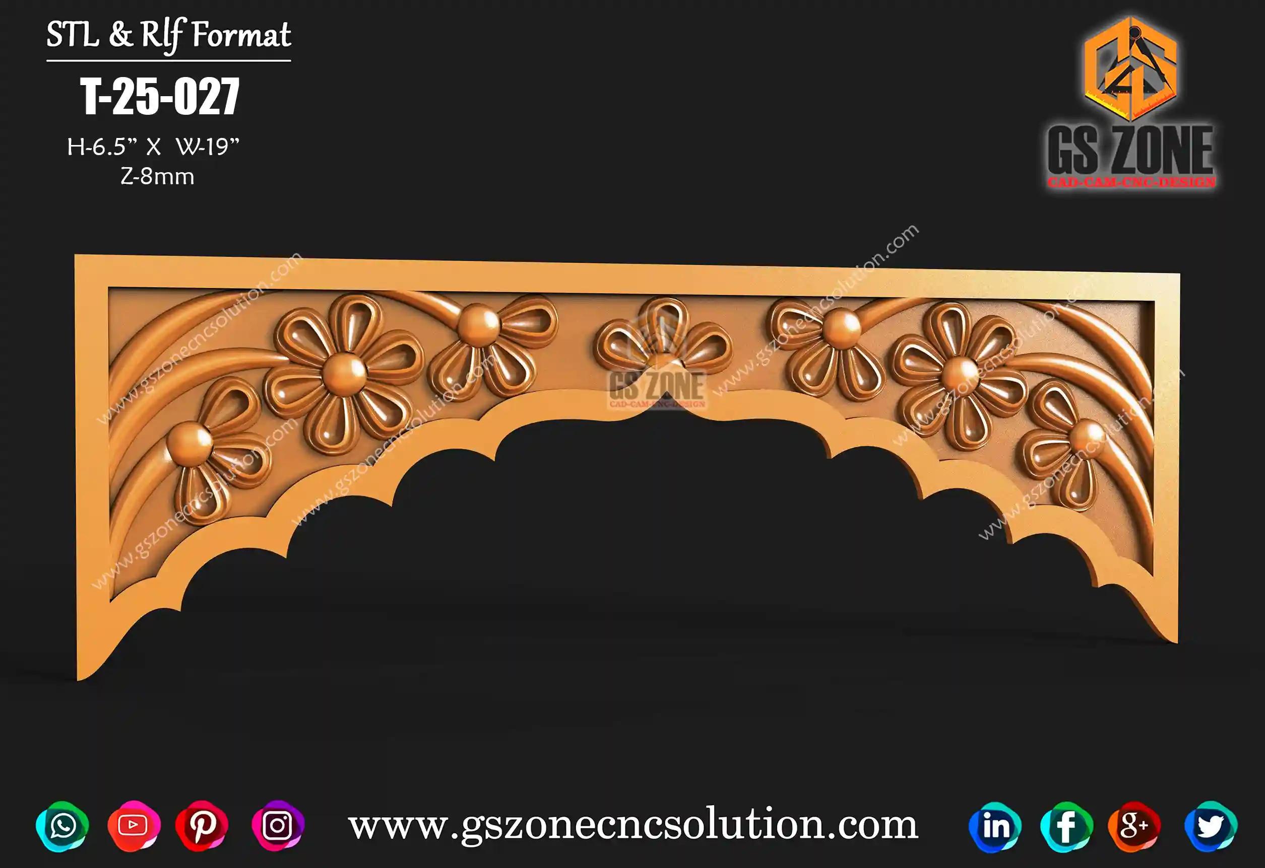🌸 GSZONE 3D CNC Floral Toran – Bold Petal Series 🔖 Product Code: T-25-027 📐 Size: H – 6.5" × W – 19" × Z – 8mm 📁 File Formats: STL & RLF (CNC Router Ready) 🧩 Application: Ideal for mandir frames, pooja unit tops, floral door arches, or traditional home décor panels. ✨ Design Highlights: The T-25-027 toran features: 🔸 Repeated floral bloom motif with petal heart shaping 🔸 Clean wave-carved bottom arch for an elegant finish 🔸 Smooth curvature and bold petal profile for deep 3D carving 🔸 Best suited for MDF, WPC, hardwood, and acrylic panels 🎯 Use For: ✅ CNC router 3D engraving ✅ Mandir door frames or headpieces ✅ Interior traditional elements ✅ Custom furniture fronts 📞 Contact GSZONE: 📱 +91 9172942608 | 📞 7903458345 🌐 www.gszonecncsolution.com 🔸 GSZONE – India’s No.1 ArtCAM & CNC Design Brand