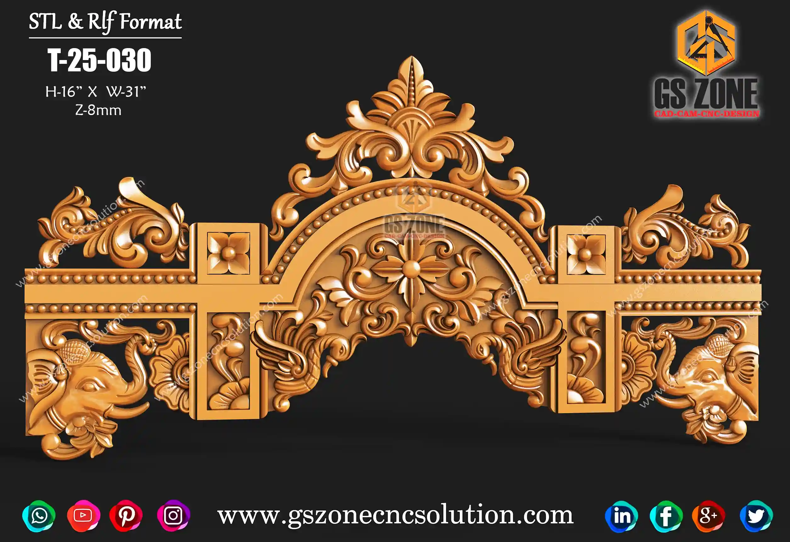 🛕 GSZONE 3D Mandir-Style Arch Design – Elephant Floral Elegance 🔖 Product Code: T-25-030 📐 Size: H – 16" × W – 31" × Z – 8mm 📁 File Formats: STL & RLF (CNC Router Ready)