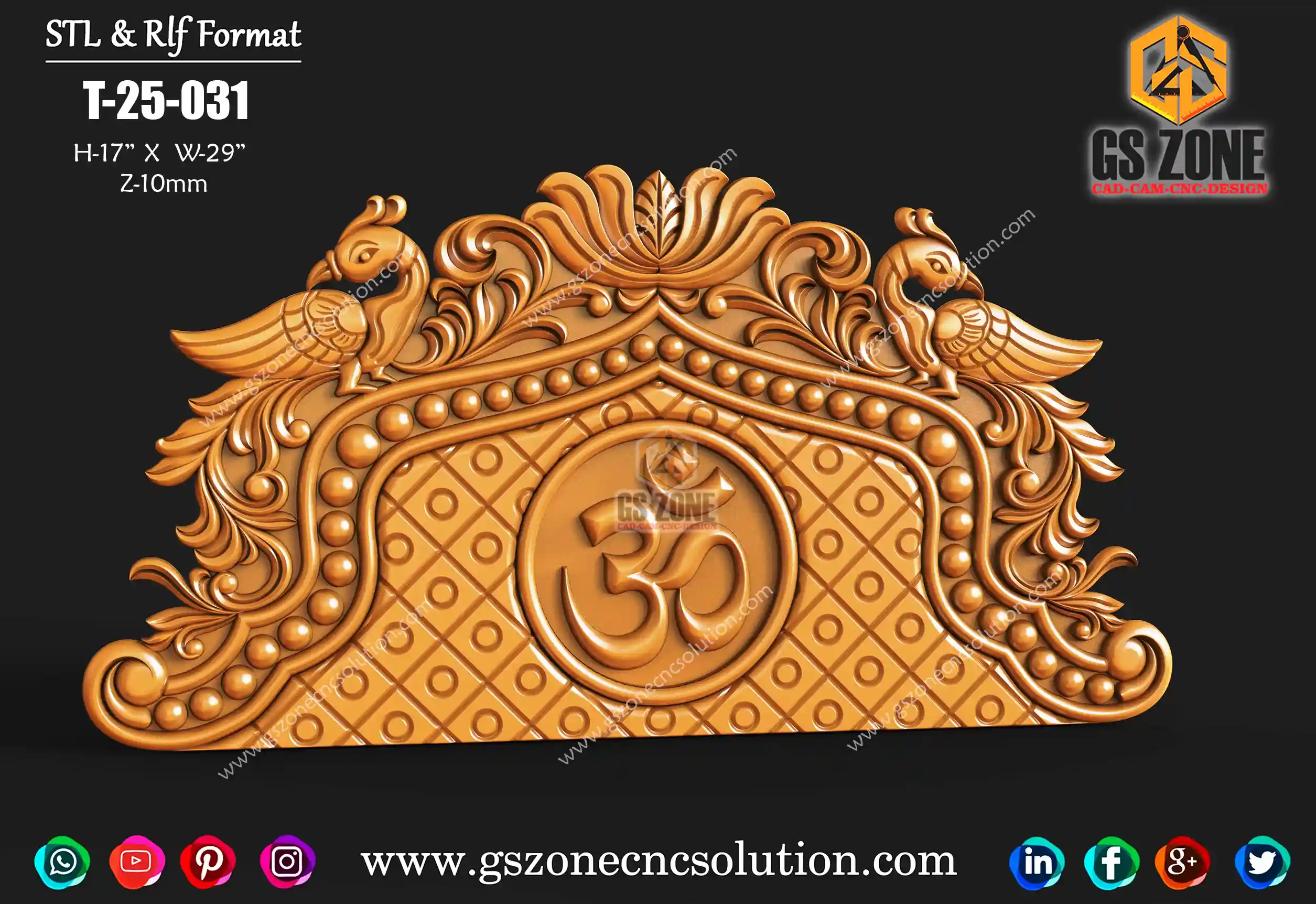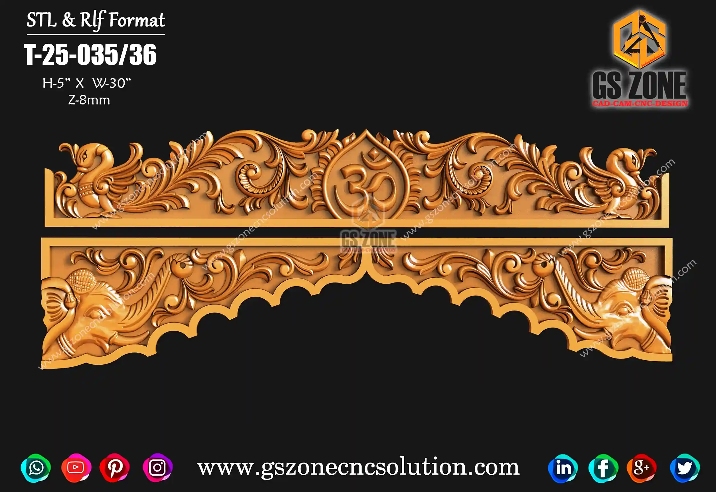 🛕 GSZONE 3D Mandir Top Design – Om Symbol with Elephant Detailing 🔖 Product Code: T-25-035/36 📐 Size: H – 5" × W – 30" × Z – 8mm 📁 File Formats: STL & RLF (CNC Router Ready)