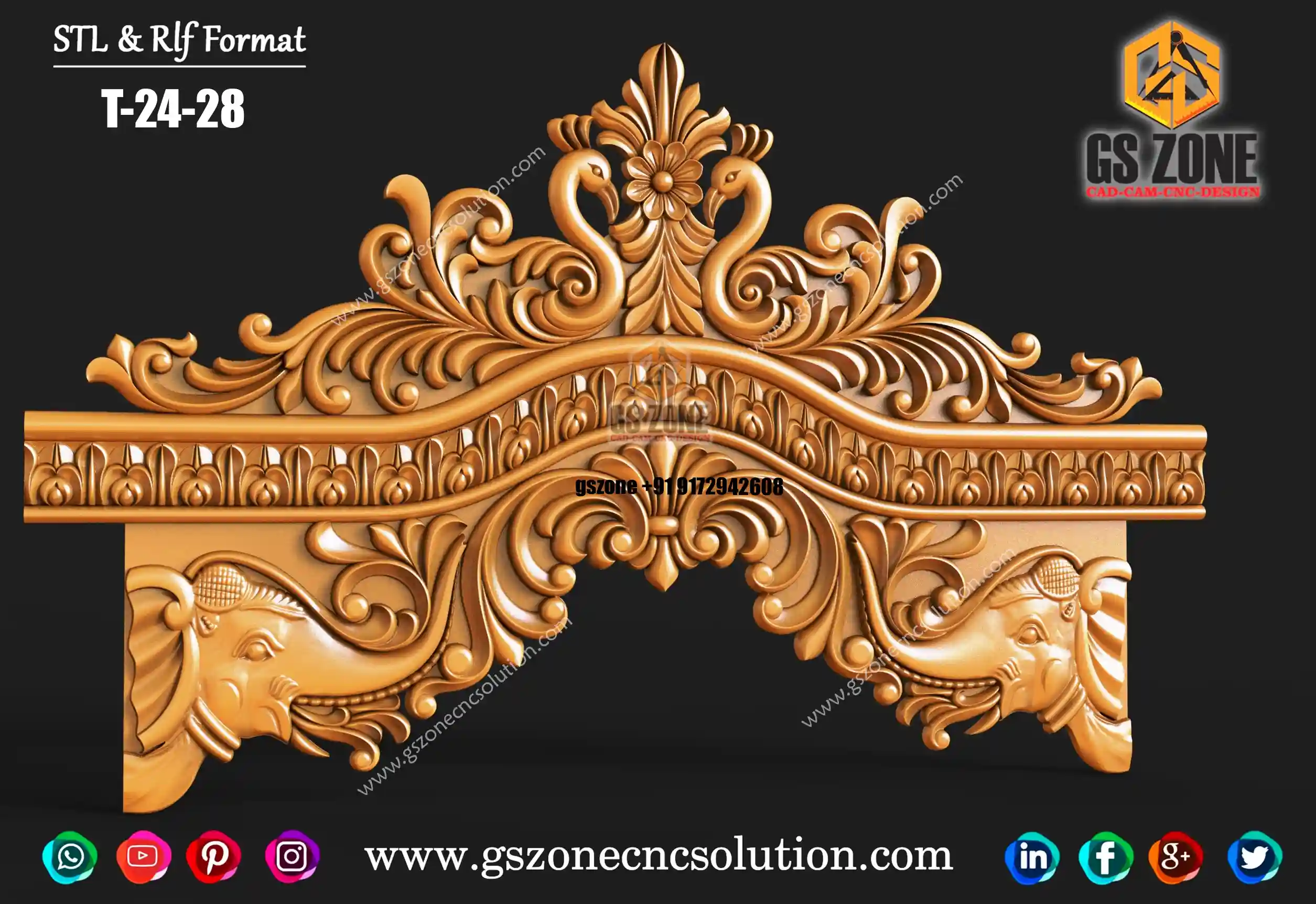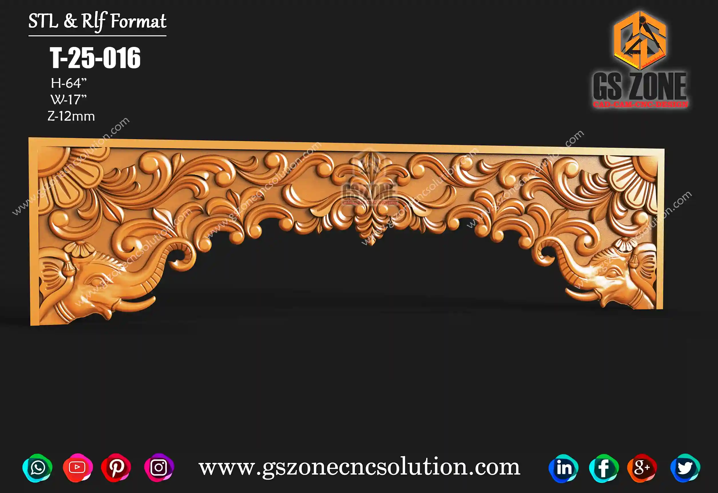 🔶 T-25-055 | Temple Frame Design – GSZone Exclusive ✨ Design Highlights Premium 3D Temple Frame for CNC Router Intricate floral motifs with traditional elephant carvings Perfect for temple entrances, pooja mandir frames, and decorative interiors 📐 Specifications Size: H – 62" × W – 46" Z-Depth: 15mm Format: STL & RLF
