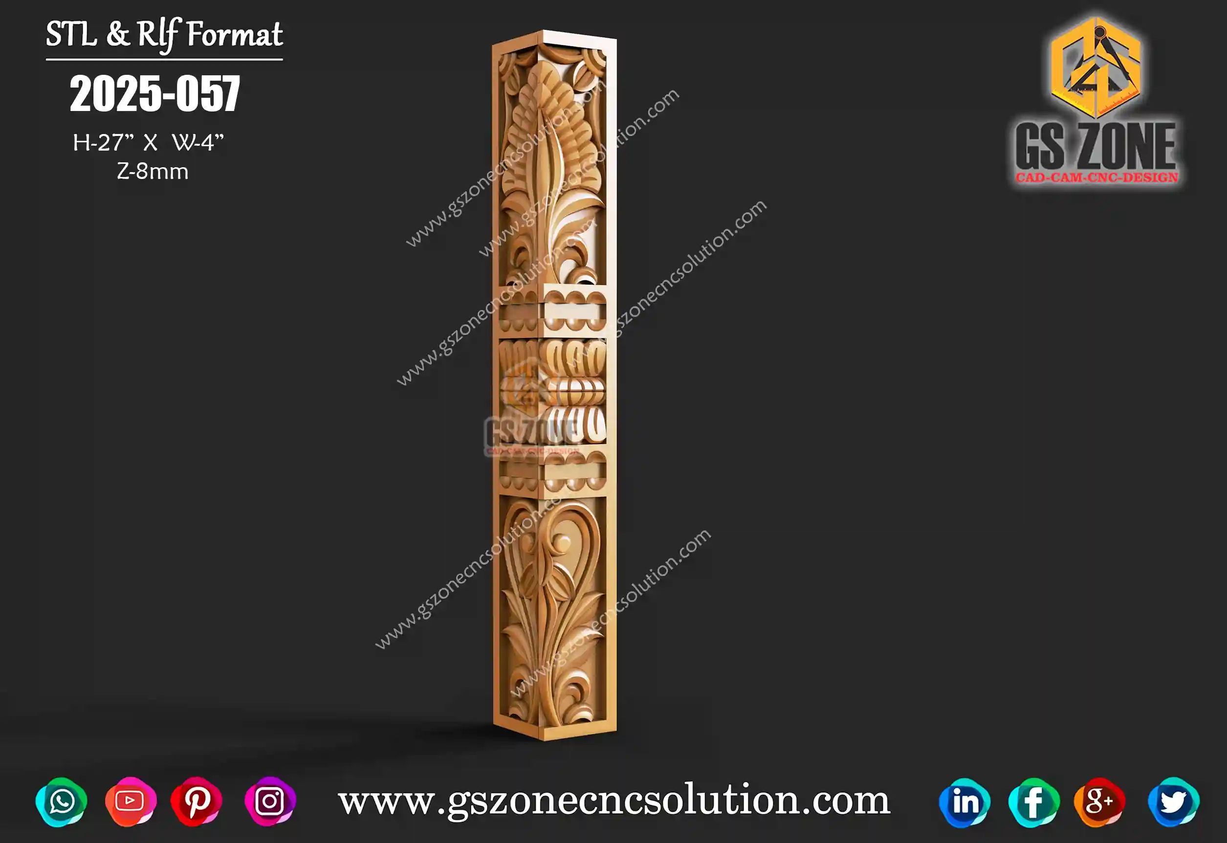 🔸 Product Name: GSZONE 3D CNC Corner Pillar – 2025-057 📐 Size: H 27″ × W 4″ | Z-Depth: 8mm 📁 File Format: STL & RLF 💻 Software: ArtCAM, Aspire, Carveco