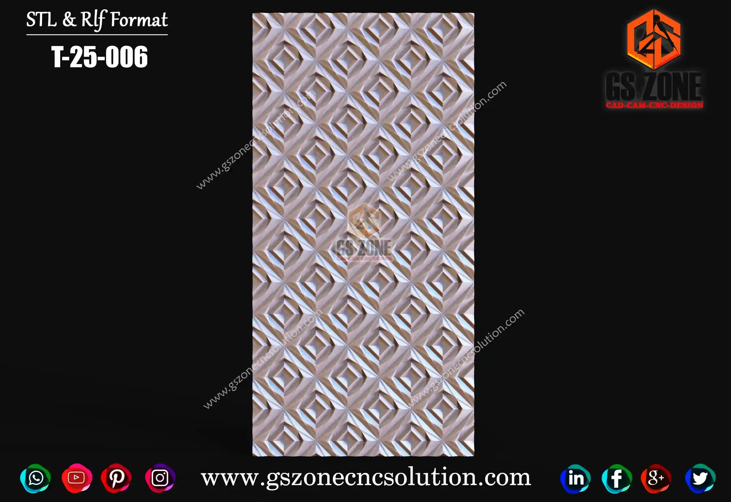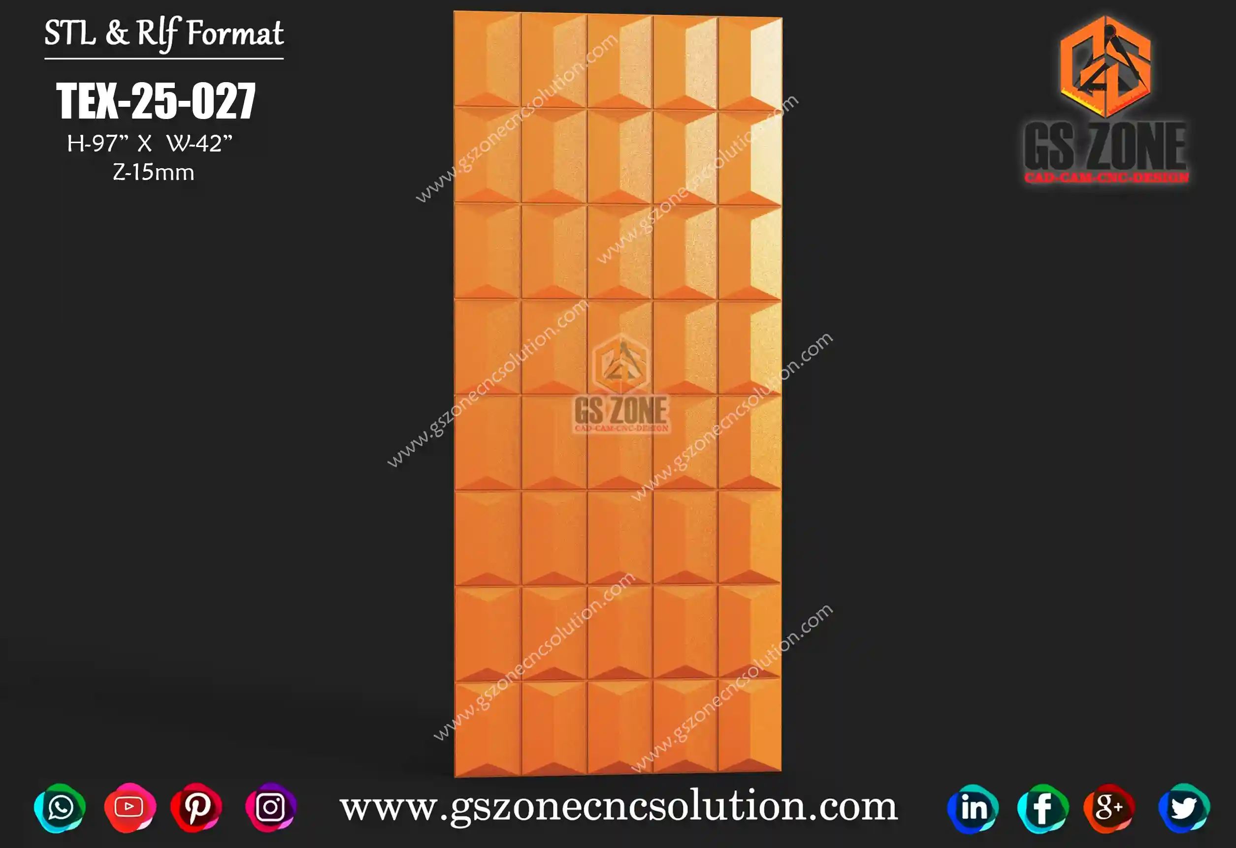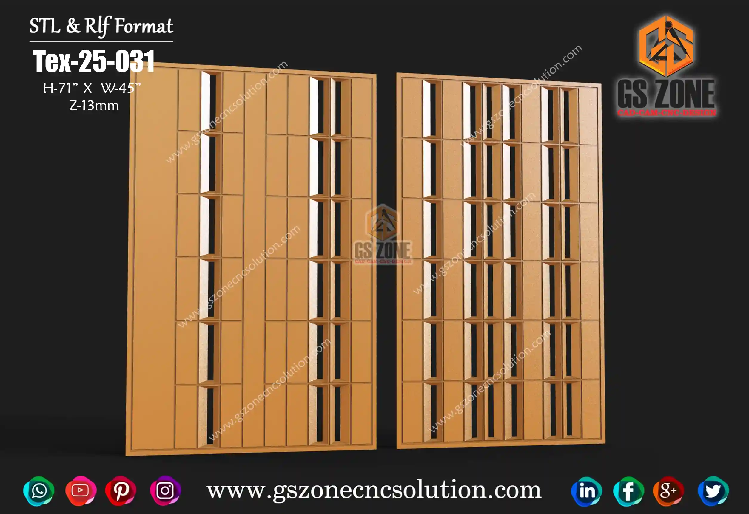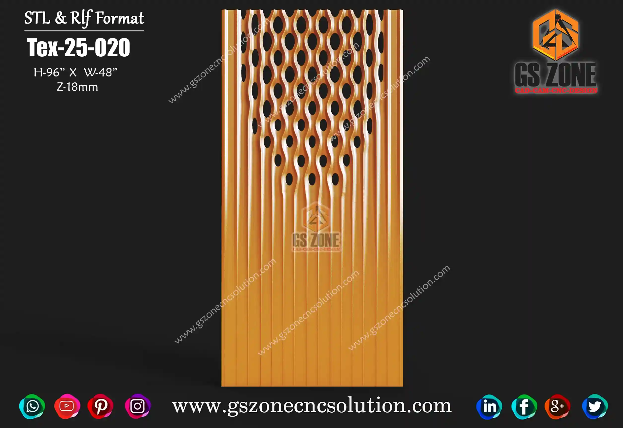 🪵 GSZone Texture Panel Design | TEX-25-043 📏 Size & Dimensions: Height – 84 inch | Width – 72 inch ⚙️ Z-Depth: 25 mm 💾 File Formats: 📂 .STL & .RLF
