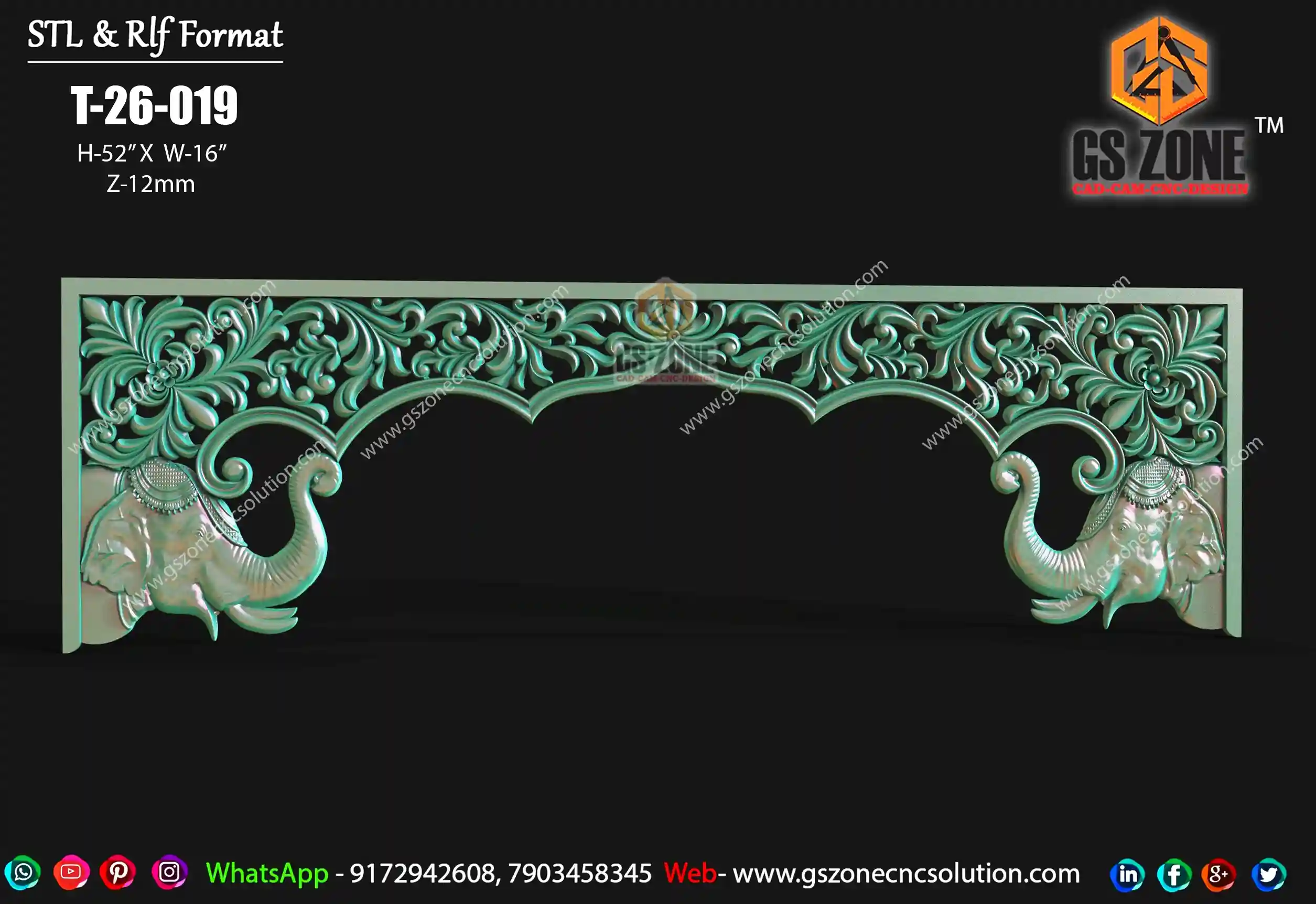 T-26-019 | Royal Elephant Arch Panel Design 📐 Size & Dimensions: • Height: 52 Inches • Width: 16 Inches • Z-Depth: 12mm 💾 File Formats Available: • STL • RLF ✨ Design Highlights: • Premium Royal Elephant (Gajraj) design 🐘 • Beautiful floral scroll carving with arch pattern • Symmetrical left-right balanced composition • Perfect for temple & royal entrance framing • Smooth curves with clean CNC finishing